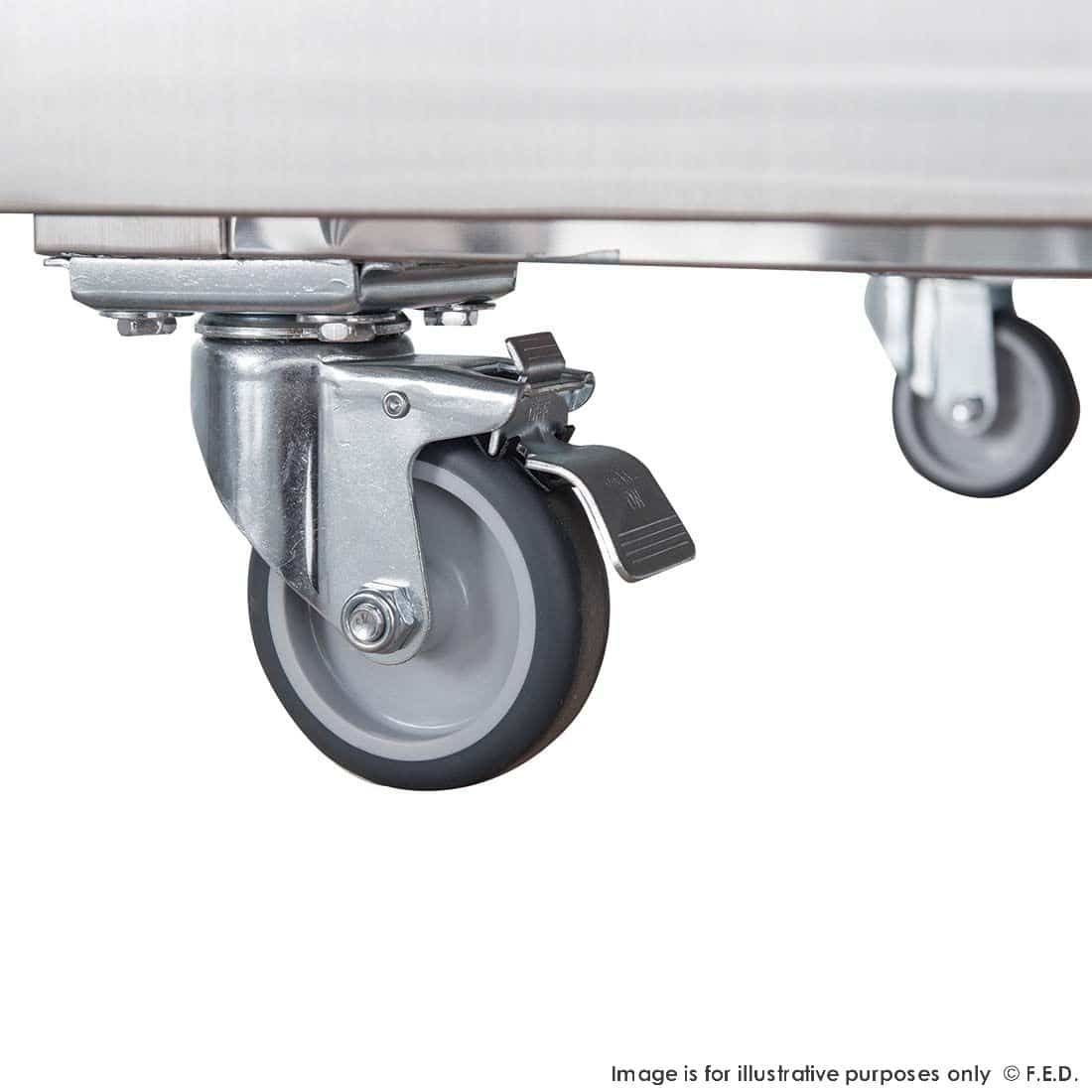 - Heavy duty castors with front wheel brakes